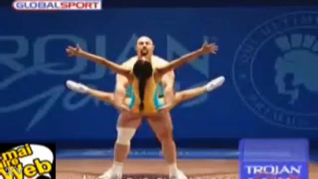 Спорт не стоит на месте, и сейчас вы увидите на сцене трахающихся гимнастов. Офигеть, никогда бы не подумал, что такое начнут показывать по телевизору. Сейчас здоровый лысый мужчина должен подержать молодую спортсменку на своем члене, как можно дольше, чтобы победить в соревновании.