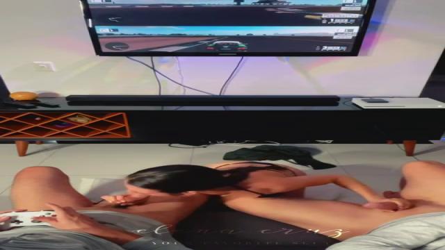 Молодая девушка сосет двум парням, пока они играют PS
